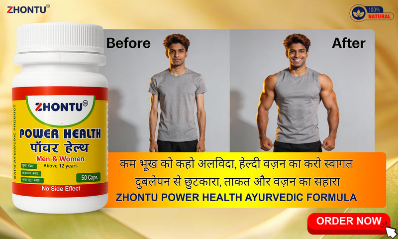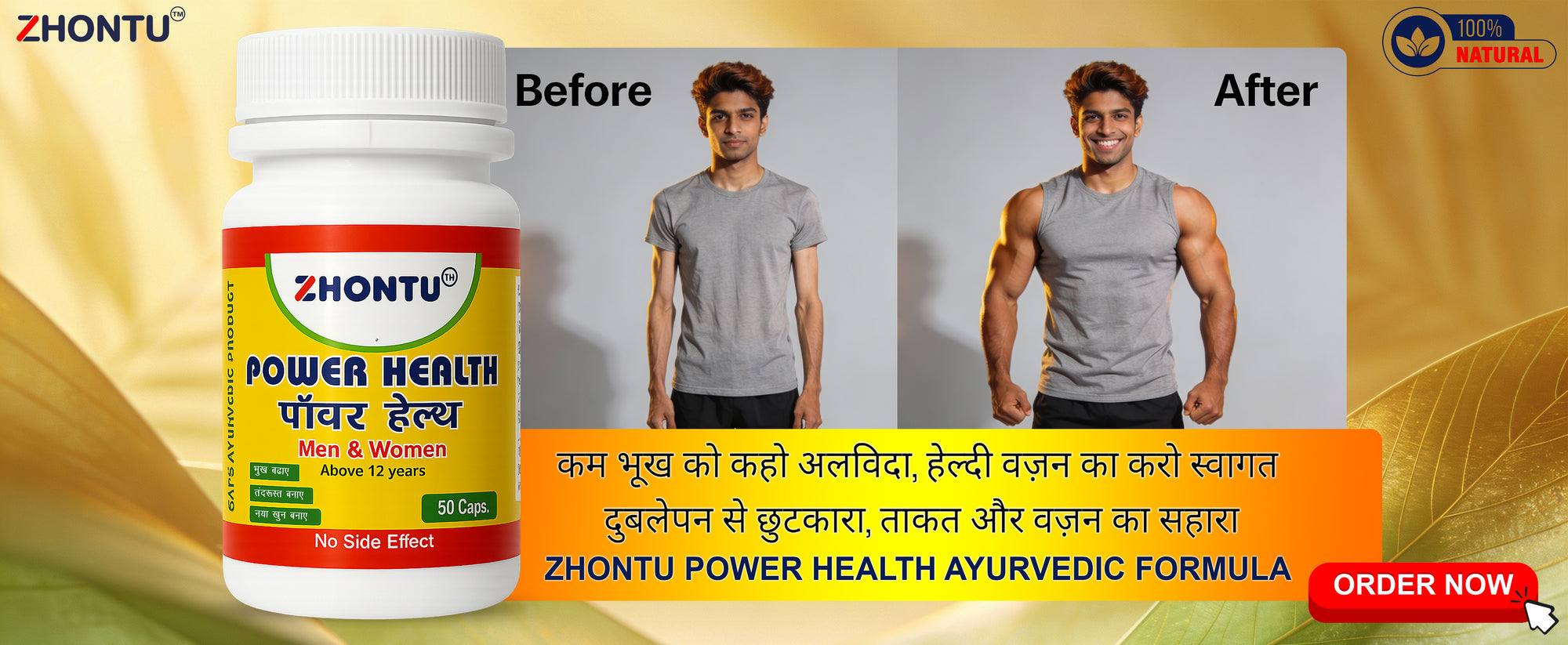 ZHONTU Power Health Capsule एक भरोसेमंद आयुर्वेदिक हेल्थ सप्लीमेंट है, जो शरीर की कमजोरी को दूर करने, भूख बढ़ाने और स्वस्थ तरीके से वजन बढ़ाने में सहायक है। यह खास तौर पर उन पुरुषों और महिलाओं के लिए बनाया गया है जिन्हें भूख कम लगती है, शरीर दुबला-पतला रहता है या वजन नहीं बढ़ पाता।